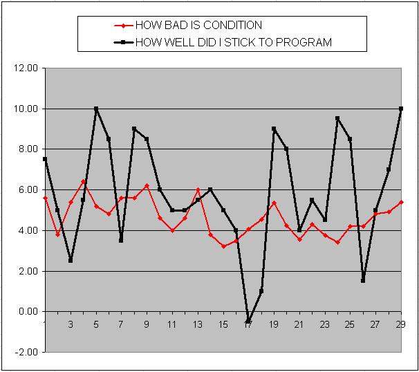 bit redder too. I guess I shouldn't be surprise. Why should I expect that cheating on my program won't have adverse effects. I wish I had more will power. It seems like sometimes I justify things in the strangest ways...like, "oh I had that chocolate yesterday, I'm not so bad today, maybe I can eat this ice cream today?". I'm angry