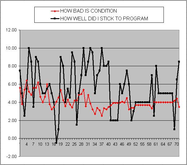 interesting thing I'm noticing is that my toenails really haven't improved since I started this whole program in April. I know however that in the past I have managed to get them 95% clear of any psoriasis condition. All I can do is keep at it an hope it turns around. I guess it would make sense that the toenails would take a long time to improve. I'm also glad to have found a way to take good pictures of my back. So far today I'm at a program score of 50 so I think I'll have one of the first