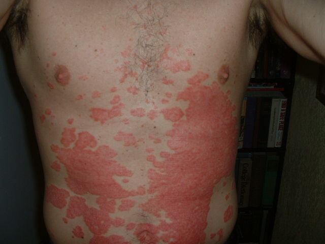 After going off my program and breaking out again I started back on it 4/1/08. When I started to see the usual results I began documenting my progress April 19, 2008. The below links point to pages that show a history of photos, daily notes and hind-sight commentaries as I document how I Beat My Psoriasis! What you eat or don't eat does make a difference!
